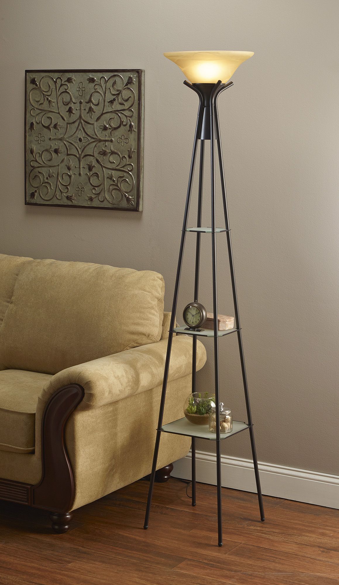Torchiere floor lamp with shelves. The average price for Floor Lamps ranges from 40 to 600. A dimmer in-line box switch on the Black Cord offers easy control to let you adjust the light levels to suit your taste and mood. The most common feature for Floor Lamps is shelf.