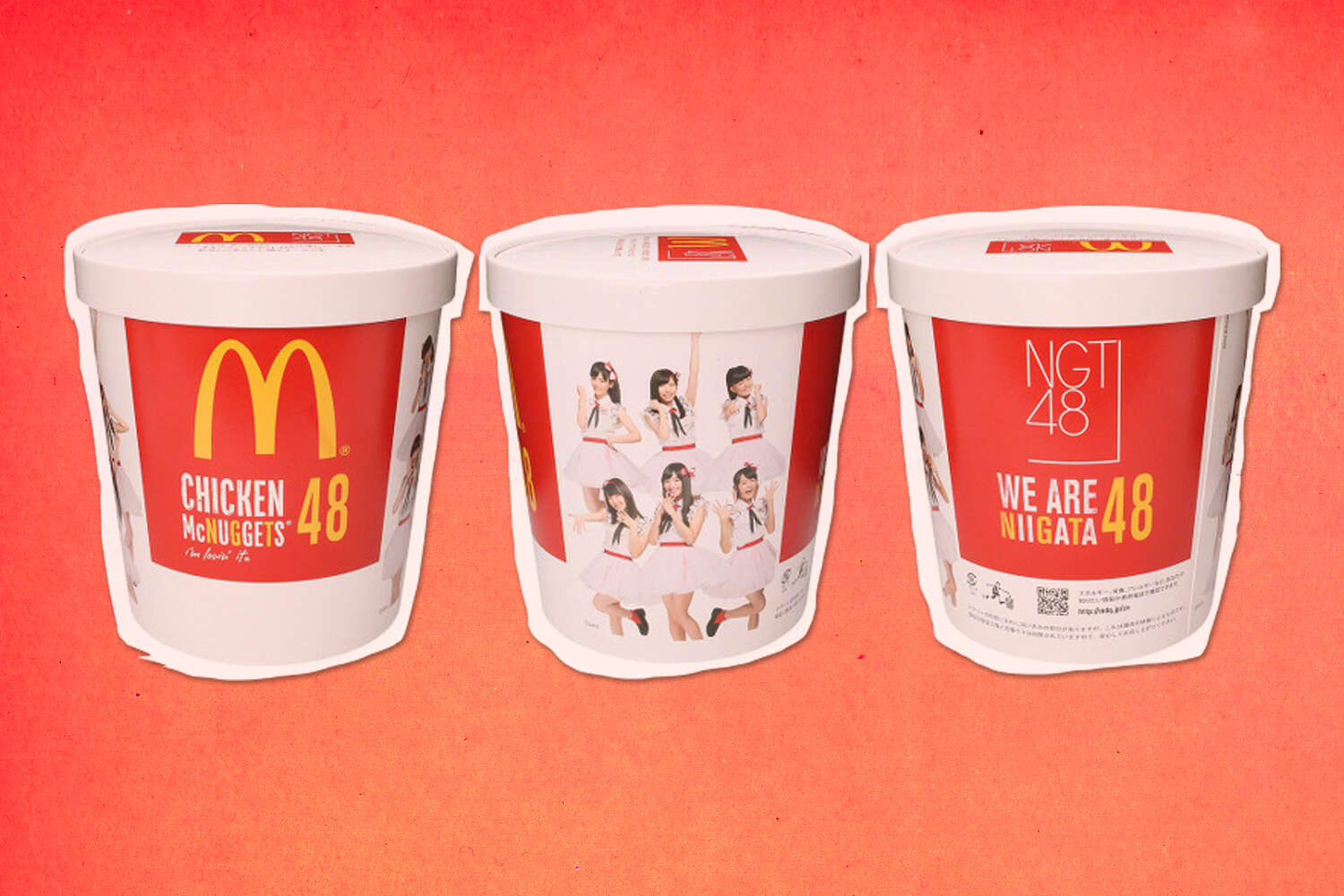 Fast food giants McDonalds have left McNugget fans mouths watering as they reveal a whopping 48 piece mega bucket. McDonalds Japan is releasing a 48-piece bucket of Chicken McNuggets that features idols from the J-Pop aka Japanese pop group NGT48-- an all-girl music group consisting of 25 members that is. We emailed McDonalds but in the meantime saw that some of our favorite food sites around the web had already published.